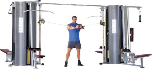 - Includes nine exercise stations: shown with 2 Lat Pulldowns, 2 Low Rows, 1 Tricep Pressdown, 2 Adjustable High/Low Stations, 1 Fixed High/Low, and 1 Pull-Up Station.